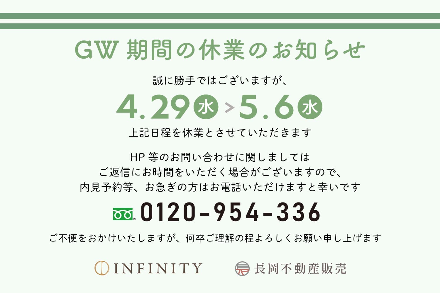 また、GW期間中の内見のご予約などお急ぎの方はお電話にてご連絡をお願い申し上げます。